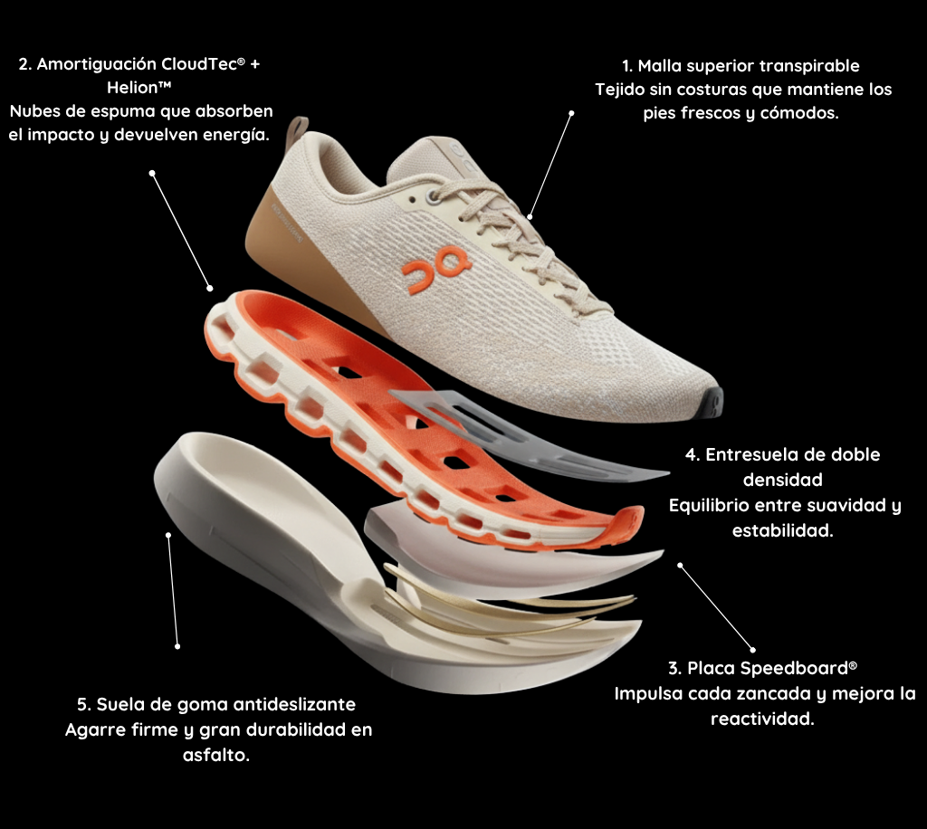 Todo comenzó con una ecuación perfecta: ¿y si cada transición fuera tan natural como surfear una ola? Los ingenieros suizos de On no dejaron nada al azar y desarrollaron los Cloud Surfer mediante Análisis de Elementos Finitos (FEA), simulando cada reacción al correr como si diseñaran el océano mismo. La revolución está en CloudTec Phase™, una entresuela donde elementos Cloud generados por computadora se comprimen secuencialmente con cada pisada, creando una transferencia de peso del talón a la puntera tan fluida que redefine la amortiguación.